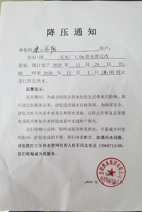 因合肥供水集团有限公司水管迁改需要,学校南校区将于2020年11月29日22:00至2020年12月1日18:00时进行降压供水。在此期间将影响高楼层用水,并会出现浑水现象。请各用水单位及师生提前根据需要,适度储水以做备用,并及时关闭水龙头和用水设施,以防止在恢复正常供水或提前恢复供水时造成意外。 后勤服务集团2020年11月27日