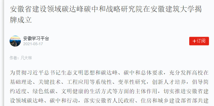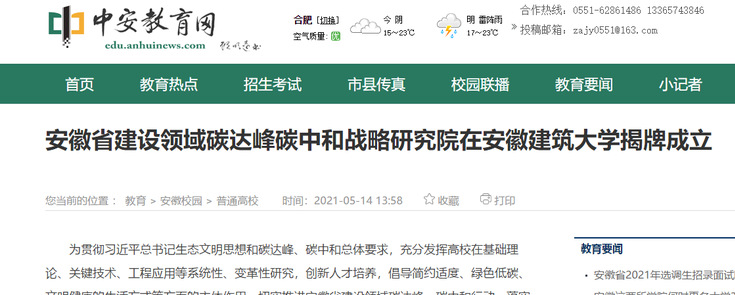 编者按:5月11日,我校与安徽省住房和城乡建设厅全面战略合作协议签约仪式暨安徽省建设领域碳达峰碳中和战略研究院揭牌仪式在南校区举行。5月14日,中安在线对此进行了报道,5月17日,学习强国平台进行了转载推介。