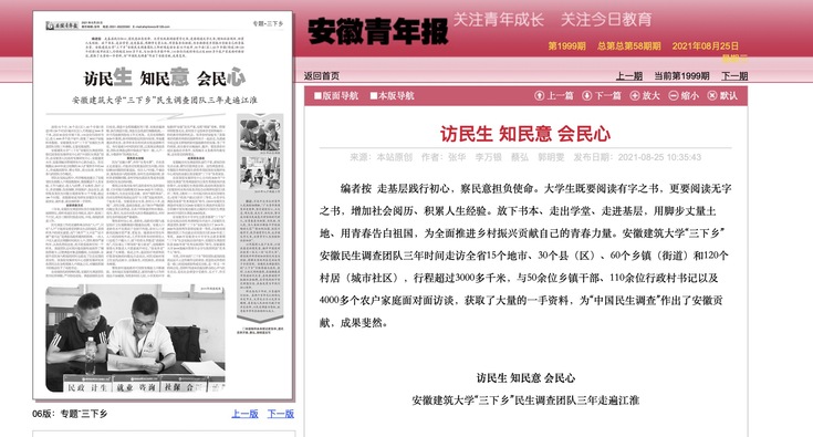 编者按 :走基层践行初心,察民意担负使命。ku游官方“三下乡”安徽民生调查团队三年时间走访全省15个地市、30个县(区)、60个乡镇(街道)和120个村居(城市社区),行程超过3000多千米,与50余位乡镇干部、110余位行政村书记以及4000多个农户家庭面对面访谈,获取了大量的一手资料,为“中国民生调查”作出了安徽贡献,成果斐然。8月25日,安徽青年报对此进行了报道。