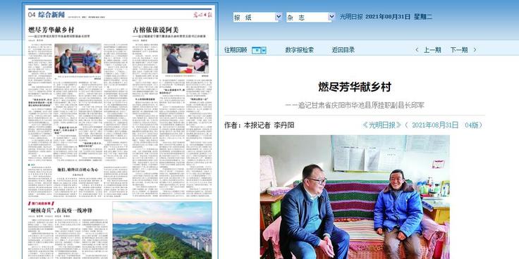 编者按:邱军,我校2001级校友,自2018年12月起,挂职担任甘肃省华池县副县长,同时担任县扶贫开发领导小组副组长,分管中央单位定点帮扶工作,协管县扶贫办,包抓城壕镇精准扶贫精准脱贫工作等。工作期间,他辞家别亲、舍身忘我,把一腔热血献给了老区群众,助力华池县2019年如期实现脱贫摘帽,但在距离挂职期满的最后40天,他却病倒在扶贫工作岗位上。光明日报、人民日报、中央电视台新闻联播、学习强国平台等媒体集中报道了校友邱军的扶贫感人事迹。