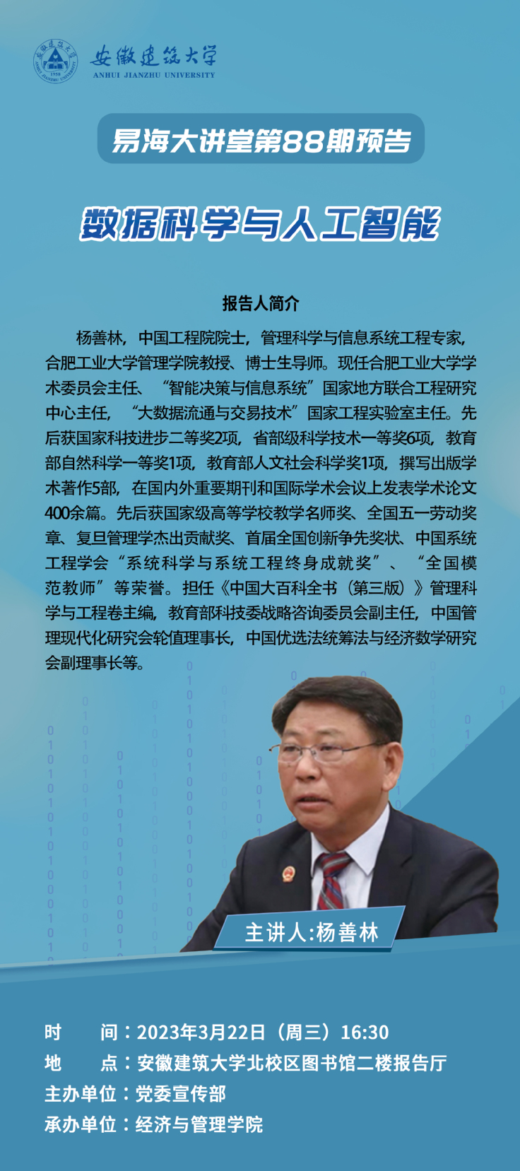 杨善林,中国工程院院士,管理科学与信息系统工程专家,合肥工业大学管理学院教授、博士生导师。现任合肥工业大学学术委员会主任、“智能决策与信息系统”国家地方联合工程研究中心主任,“大数据流通与交易技术”国家工程实验室主任。先后获国家科技进步二等奖2项,省部级科学技术一等奖6项,教育部自然科学一等奖1项,教育部人文社会科学奖1项,撰写出版学术著作5部,在国内外重要期刊和国际学术会议上发表学术论文400余篇。先后获国家级高等学校教学名师奖、全国五一劳动奖章、复旦管理学杰出贡献奖、首届全国创新争先奖状、中国系统工程学会“系统科学与系统工程终身成就奖”、“全国模范教师”等荣誉。担任《中国大百科全书(第三版)》管理科学与工程卷主编,教育部科技委战略咨询委员会副主任,中国管理现代化研究会轮值理事长,中国优选法统筹法与经济数学研究会副理事长等。