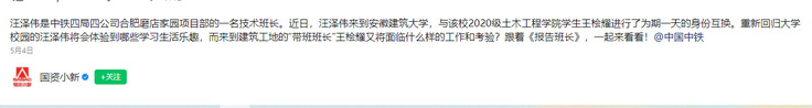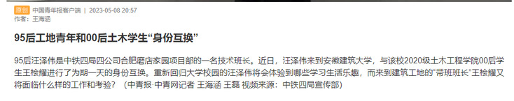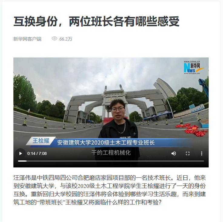 编者按:实践育人是新形势下高校教育教学工作的重要载体,是推动形成全员全程全方位育人的有效途径。学校始终重视育人实效,注重提升学生创新意识和实践能力,在拓宽实践育人途径、提升人才培养质量等方面取得一定成效。近日,校党委宣传部、就业工作处、土木工程学院联合中铁四局开展“生”临“企”境主题活动,中铁四局一名技术班长与我校土木工程学院学生进行一天的身份互换,在换位思考同时获得别样体验。对此,中青报、工人日报、新华网、国务院国资委客户端等多家媒体对此进行报道。