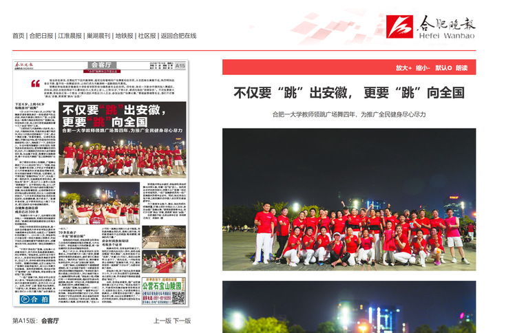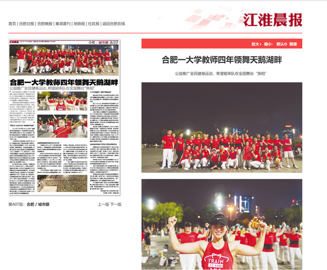 编者按:我校形体与健美操专业教师李裕琼连续四年领跳广场舞,广场舞团队在她的带动下从最初的20人变成上百人。李裕琼不仅免费教市民跳舞,还利用业余时间参加培训,获得大众广场舞一级社会体育指导员、一级广场舞教练员和一级广场舞裁判员等专业证书,并将自己每天晚上跳的舞步动作融入到日常的课堂教学中,用实际行动公益推广全民健身运动。江淮晨报、合肥晚报等媒体对此进行报道。