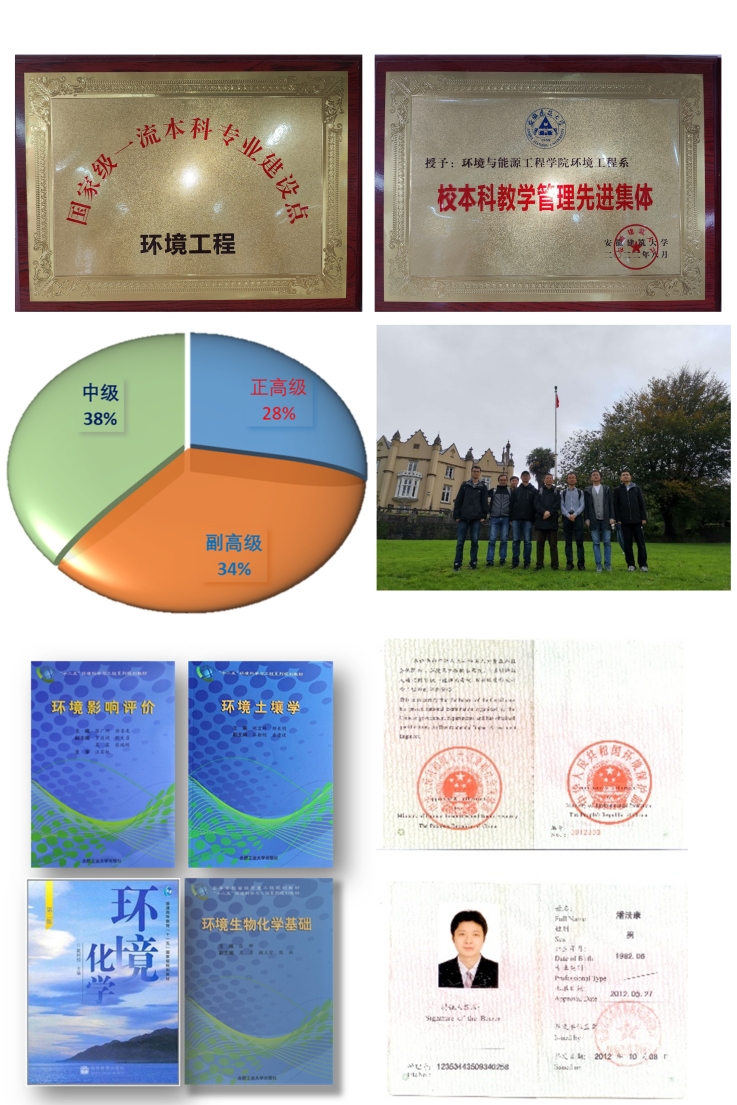 近五年,环境工程专业教师承担安徽省重大或重点教学研究项目十余项,获批省级教学研究团队2项。专业教师参与承担了多项国家重大水专项、国家重点研发、安徽省科技重大专项等重大课题。获批了14项国家自然科学基金资助。获得安徽省科技技术一等奖1项、二等奖3项、三等奖3项;环境保护技术二等奖1项;华夏二等奖1项;发表SCI期刊论文120余篇,科研经费2000多万元。