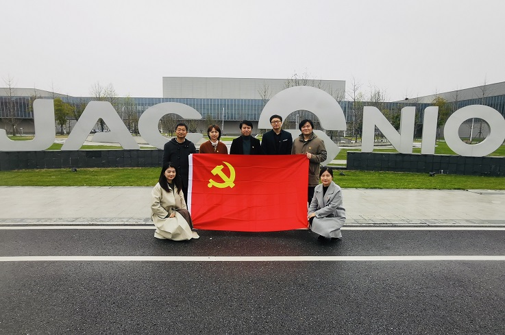 在蔚来中心合肥先进制造基地,江淮汽车的党支部委员带领党员们了解了蔚来汽车的技术发展和历史沿革。