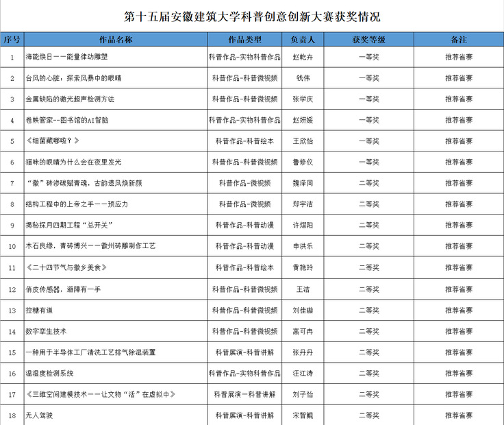 根据《关于举办第十五届安徽省百所高校百万大学生科普创意创新大赛的通知》相关文件要求,经前期动员宣传、学院推荐、专家评审等环节,现将本次大赛获奖予以公示:6项作品获一等奖、12项作品获二等奖,17项作品获三等奖,机械与电气工程学院、电子与信息工程学院、艺术学院获评优秀组织单位。