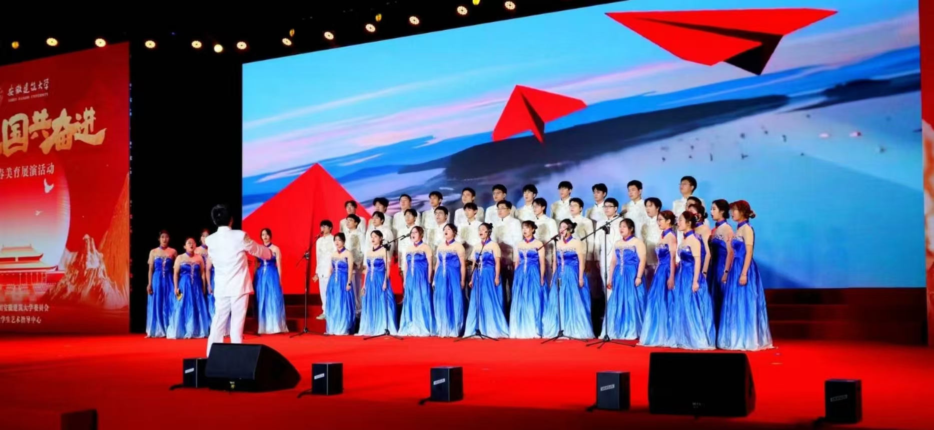 展演在校舞蹈俱乐部的中国舞《九州和韵》表演中拉开序幕,灵动的舞姿描绘出祖国大地的壮丽山河,展现出九州大地的和谐韵律,瞬间点燃了现场的热烈气氛。紧接着12个学院美育俱乐部接力登台,以音乐为笔,用歌声唱响时代强音,尽情抒发建大学子对祖国的炽热深情。