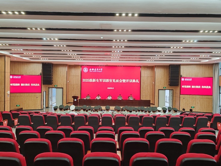 本网讯 9月13日上午,2025级新生军训教官见面会暨开训典礼在紫云路校区徽风楼2楼报告厅顺利召开。校党委常委、副校长高跃峰出席会议并发表讲话,校人武部负责人、中国人民解放军某院校官兵以及各学院分管学生工作的书记共同参加。