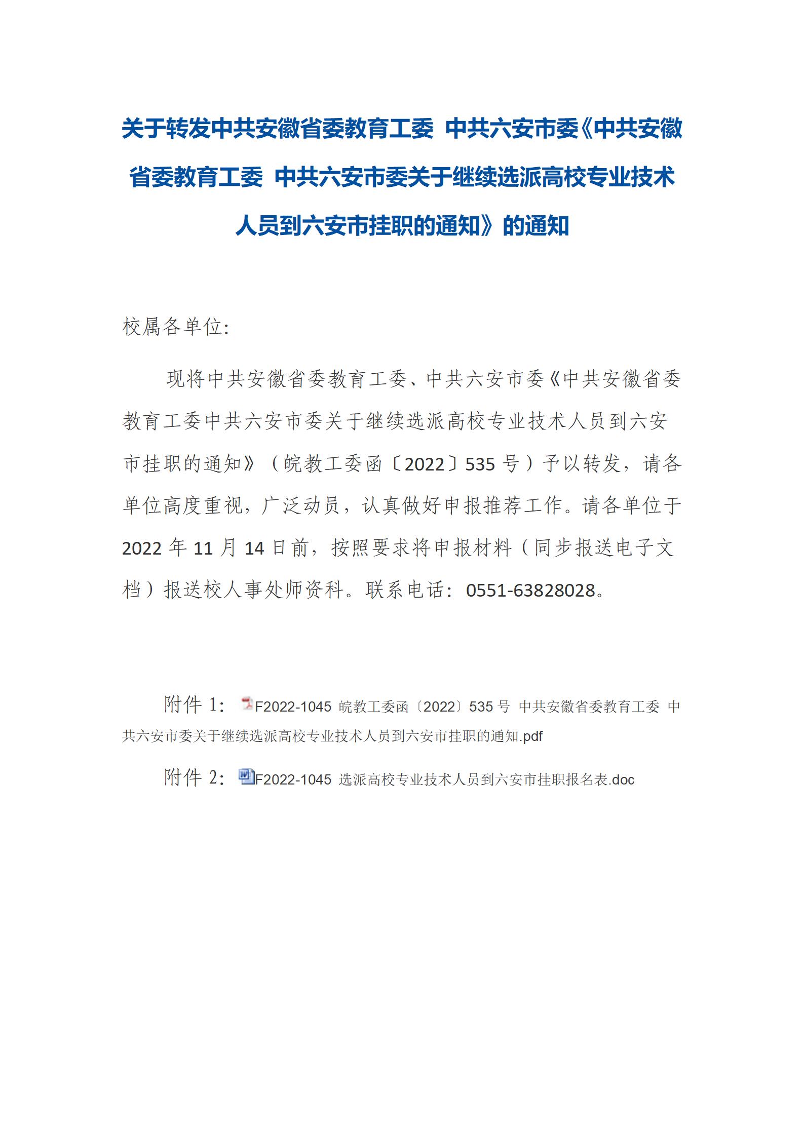 转发《关于转发中共安徽省委教育工委 中共六安市委<中共安徽省委教育工委 中共六安市委关于继续选派高校专业技术人员到六安市挂职的通知>的通知》