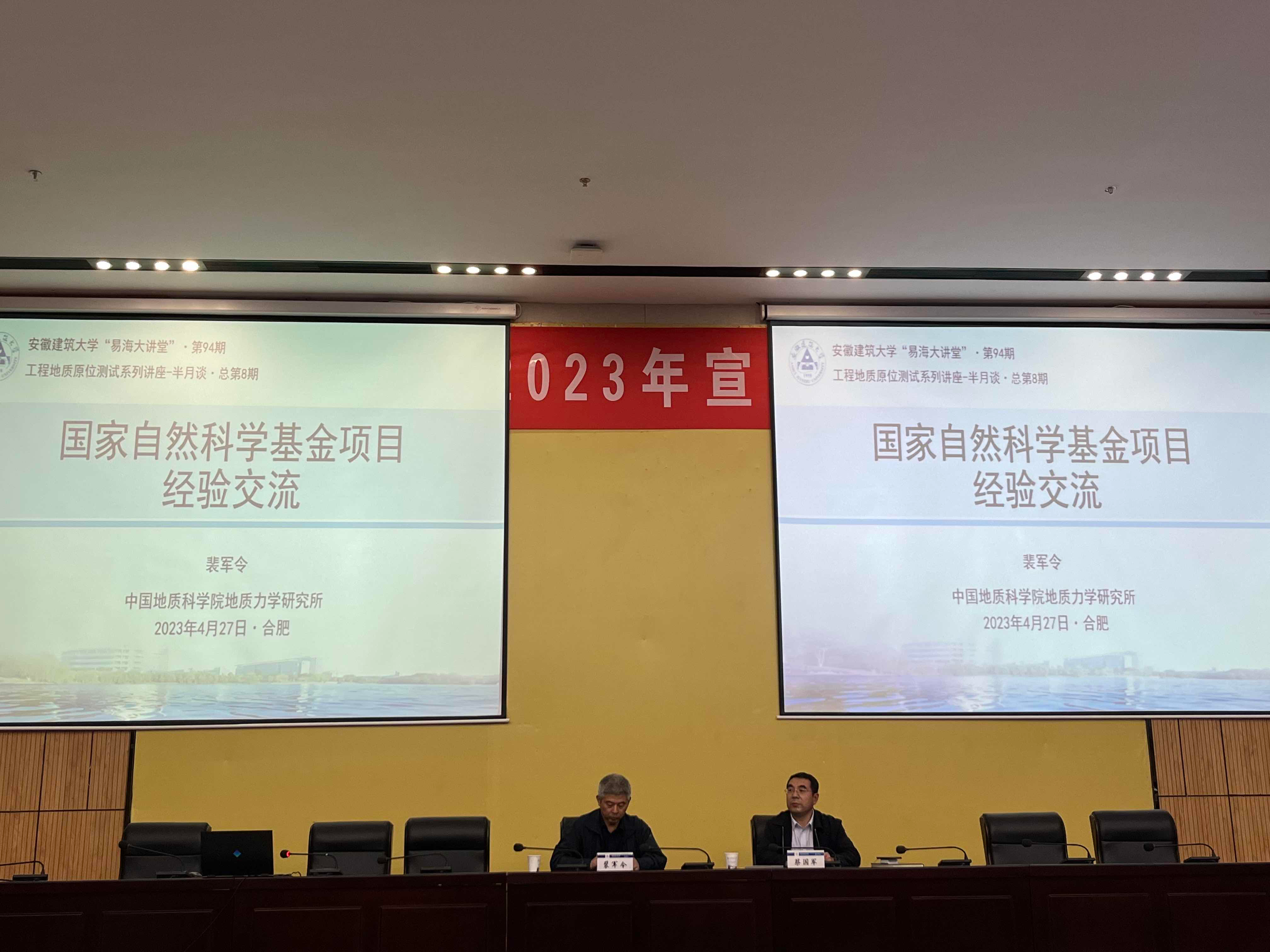 4月27日下午,由校党委宣传部主办,安徽省智能地下探测技术研究院、ku游官方土木工程学院承办的第94期“易海大讲堂”在南校区实验综合楼二楼报告厅举行。中国地质科学院地质力学研究所裴军令研究员做客“易海大讲堂”,并做题为《国家自然科学基金项目经验交流》的报告,会议由校党委常委、副校长蔡国军教授主持,土木工程学院执行院长张宁教授、副院长陈东教授、安徽省智能地下探测技术研究院老师出席大会。
