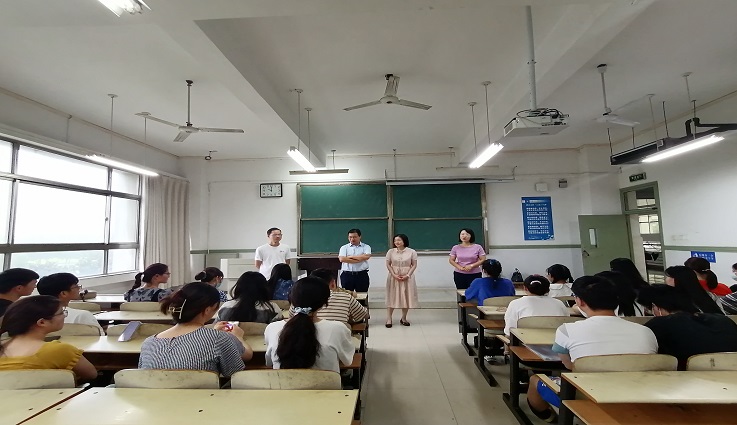 本网讯 8月12日上午,外国语学院党总支书记林莉兰、院长徐春山、副书记汪令宇、副院长张永军及学院辅导员樊远兵前往考研自习室看望慰问暑期留校考研学生,并为学生送上爱心口罩和酒精喷雾等防疫物资。
