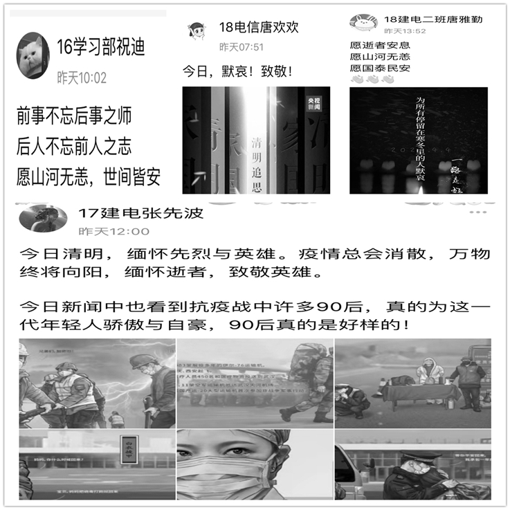 出于疫情防控需要,同学们无法外出参加集中祭奠,年轻的学子便采用网上接力的方式,利用QQ、微信等平台,转发、留言等方式寄托哀思。上午十时,防空警报长鸣,响彻全国,同学们保持肃穆,默哀三分钟致敬英雄。