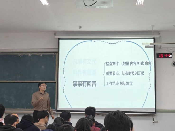 王昊禾以《学生干部的自我修炼与养成》为题,向全体学员阐释了学生干部的深刻内涵,详细介绍了学生干部所必备的思想素质、道德素质、服务意识和业务能力等;他认为,学生干部是一个职位,更是一种责任与担当,希望班委们能学会分工合作,实现专业班级乃至学院学校的共赢。