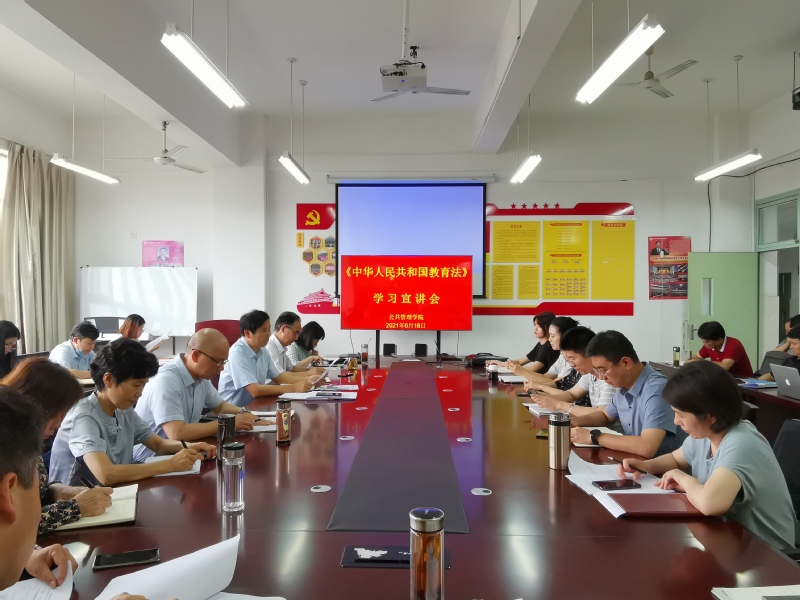 会上,丁仁船传达了学校关于开展学习宣传贯彻实施新修订的教育法的通知,领学了《中华人民共和国教育法(2021修订)》。2021年4月29日,第十三届全国人民代表大会常务委员会第二十八次会议审议通过了《全国人民代表大会常务委员会修改<中华人民共和国教育法>的决定》,2021年4月30日起实施。该法共分为十章、八十六条,为发展教育事业提供了法律保障。