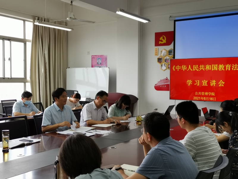 本网讯 为引导全院教职工充分认识教育法修订重大意义,切实做好贯彻实施,6月16日,公管学院组织开展《中华人民共和国教育法(2021修订)》学习宣讲会,院长丁仁船宣讲新修订的教育法,学院全体教职工参加。