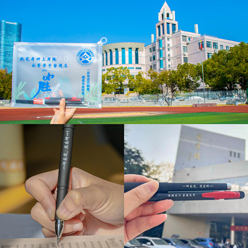 学院为考研学子们发放了精心准备的爱心文创考袋,根据考场要求对标准备的黑色签字笔、2B铅笔等文具,定制考袋印有“执笔考研上岸路 公管学子皆题名”“所有逆风翻盘 皆是有备而来”的美好期望,向考研学子们表达公管学院始终与你们同在的关爱;定制笔上刻有“一研为定 定为研一”和公管院训,为即将奔赴考场的学子们送上美好祝福。