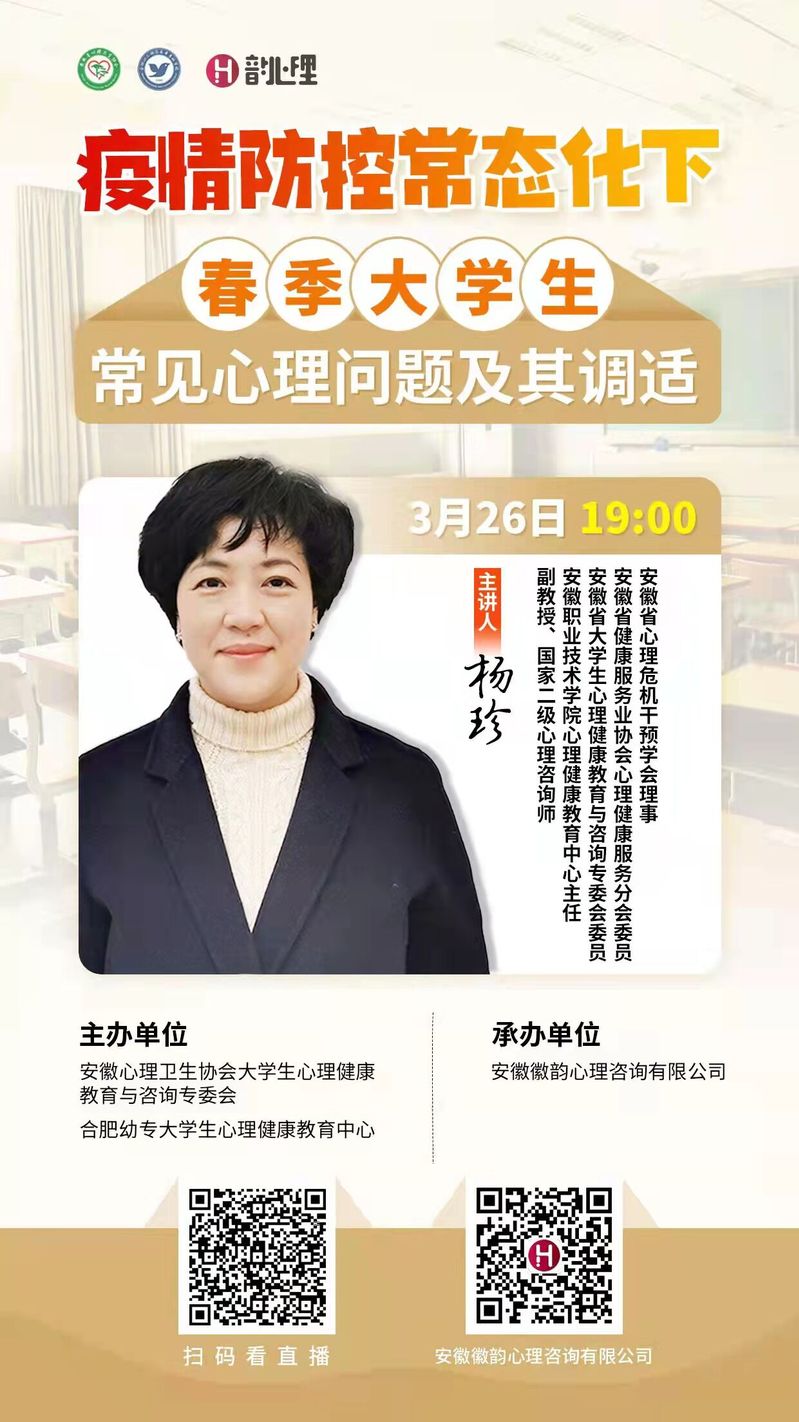 本次疫情防控常态化下春季大学生常见心理问题及其调试”心理直播课是由安徽心理卫生协会大学生心理健康教育与咨询专委会、合肥幼专大学生心理健康教育中心与徽韵心理咨询有限公司联合举办,特别邀请安徽省心理危机干预学会杨珍理事,针对春季大学生特别是在疫情防控常态化下常见心理问题进行疏导及调试,引导广大学生提高心理免疫力,增强自我情绪调节能力,坚定战胜疫情信心!(文/图:吴永杰 魏雪影;审稿:李道先)