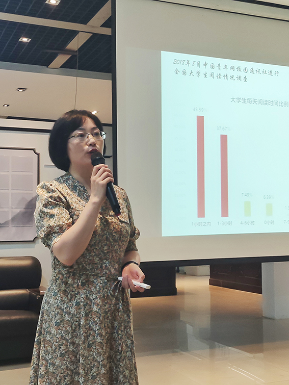 本网讯 为进一步加强学风建设,增强学生的阅读兴趣、熏陶阅读品味、丰富人文底蕴,公共管理学院持续开展学风建设系列活动。5月23日下午,“师与书香 悦读畅享”导读会第三期于F楼一楼中庭开展,本期导读会邀请人文素质中心文艺学博士、副教授董玉洪为导读人,40名学生参加本次活动。