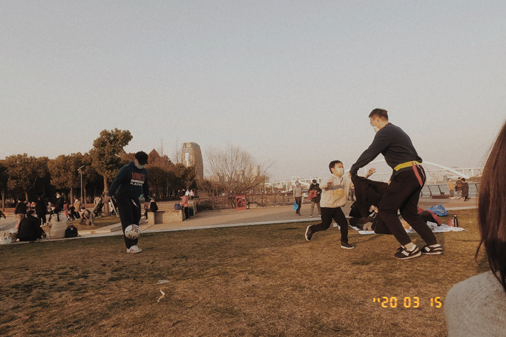 在家隔离了很久的人们都戴着口罩到附近的公园和亲友们进行简单的娱乐活动