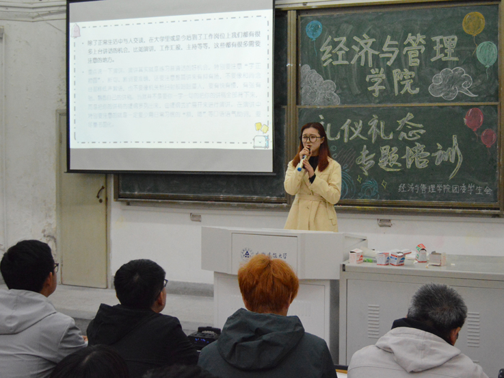 礼仪主讲人首先详解了礼仪的含义,强调礼仪的本质并不在于其复杂的外在形式,而是在于对他人的尊重,尊重则通过适当的形式表现出来。随后主讲人结合未来求职需要,详细介绍了着装的穿法以及搭配问题。西装的纽扣是如何系的、领带的适宜长度是多少、女生的妆容着装多少为宜等等一系列问题,虽然这些细节看起来微不足道,但当主讲人娓娓道来时,大家发现原来这些简单的小事情里面也都大有学问。