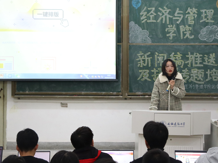 接着,主讲人向现场同学介绍了微信公众号推送、新闻稿写作以及摄影的内容。首先利用软件向大家演示了如何选取推送素材与排版,强调了新闻写作的格式、要求及注意事项,在摄影部分就宏观场面照片的拍摄以及人物细节特写的抓拍向同学们做了介绍,并提醒大家注意色彩的搭配、明暗的对比和构图留白等,通过不同的照片示例展开详细的讲解,使同学们受益匪浅。