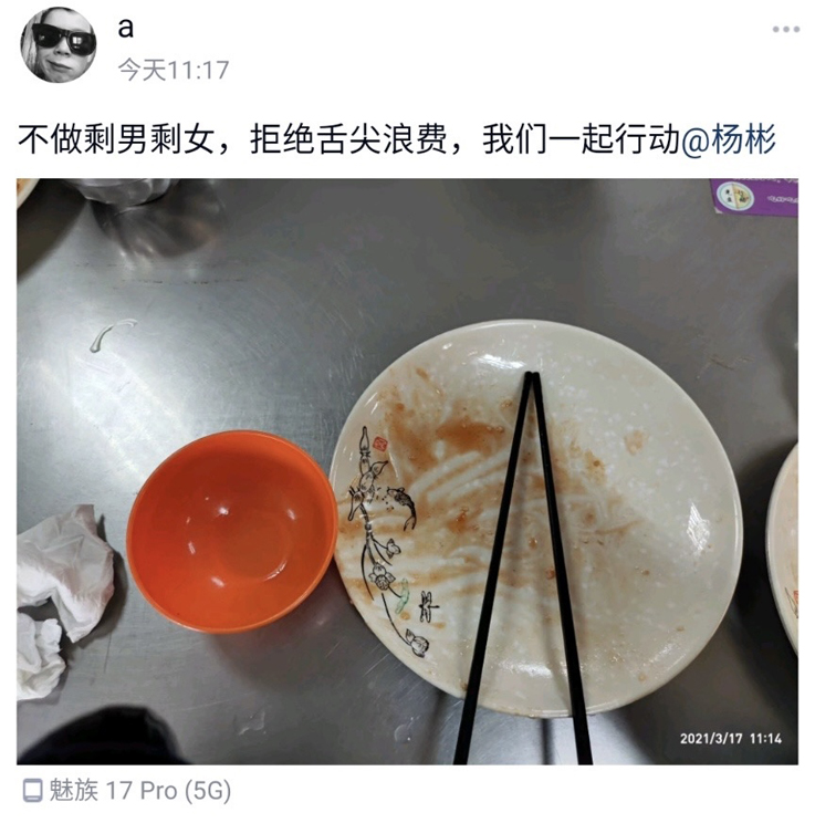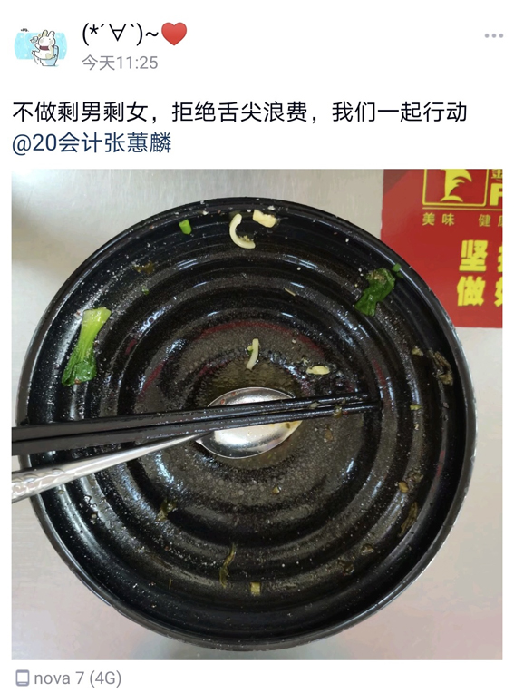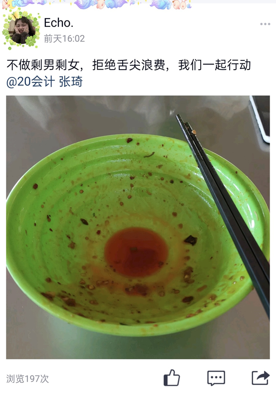 本次活动采取线上线下相结合的方式进行,线下组织学生设计主题海报,并张贴于南、北食堂进行广泛宣传动员,线上收集同学们的光盘打卡照片,同时配文“不做剩男剩女,拒绝舌尖浪费”并@好友进行光盘打卡接力,有效增强了活动的参与度与影响力。活动中,同学们积极参与,纷纷表示今后会从自身做起,厉行勤俭节约,反对铺张浪费。
