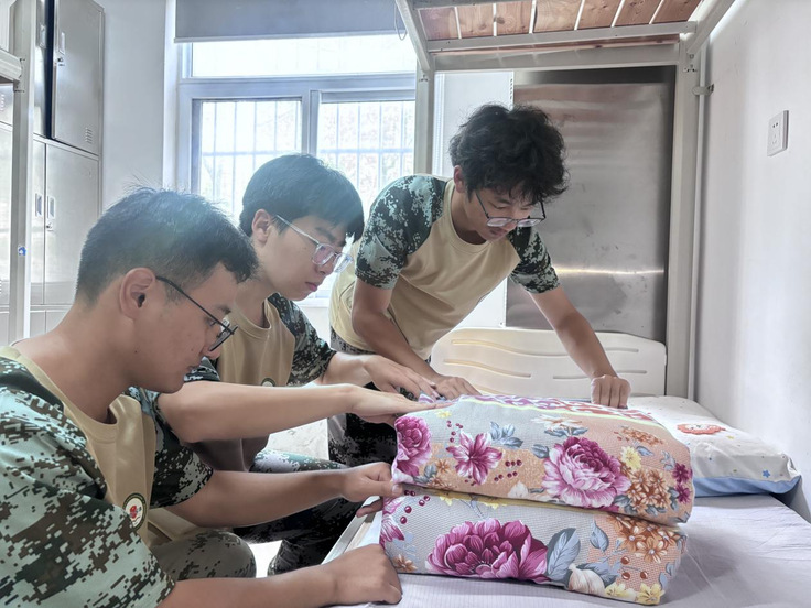 活动现场,教官们首先进行了精彩的示范,铺平、折叠、压实、捏线等动作干净利落,一气呵成。原本松软的被子在教官手中仿佛被施了魔法,迅速变成了棱角清晰、整齐划一的“方块”。同学们围拢在四周,目不转睛,发出阵阵惊叹。示范结束后,同学们在教官的耐心指导下开始动手实践。初次尝试,同学们手忙脚乱,教官们则穿梭其间,逐一纠正动作,讲解要领。在反复的练习和调整中,同学们逐渐掌握了技巧,手中的被子也渐渐有了“豆腐块”的雏形。虽然过程不易,但看到自己的劳动成果,同学们脸上都洋溢着成就感。