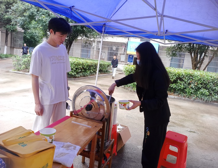 “来喝免费的绿豆汤啦”,食堂的工作人员不停地吆喝吸引同学们,这是饮食中心特意为师生准备的免费绿豆汤。为保障午餐时能完成供应,食堂早早就将绿豆熬上,颗颗饱满,粒粒光滑,经过慢火熬煮,绿豆酥烂起沙,在初夏时节喝上一杯,既能帮助补充水分,还有助于祛火,令人神清气爽,路过的同学们都相约着要盛上一杯。