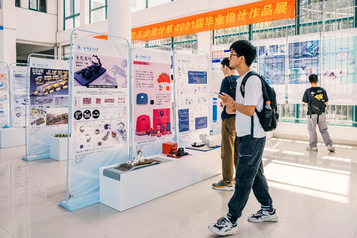 本网讯 从6月7日开始,为期一周的机械与电气工程学院2021届工业设计专业毕业设计作品展在机电楼一楼大厅拉开帷幕。