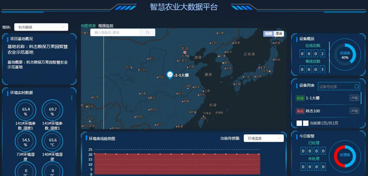 智慧农业平台的内容覆盖农产品生产、运输、销售全过程。包括智慧农业物联网系统、农产品溯源系统、大数据分析系统、智慧农机系统等子系统。其中农业物联网系统对农产品的生产过程进行监测,对环境参数进行检测和控制,可以通过摄像头远程监控。农业物联网设备自动控制系统,客户根据当前环境需要设定植物生产环境值,根据传感器采集数值与系统原设定数值对比,达到条件则自动控制通风、遮阳、补水、补光灯等环境控制设备,自动调控温室内环境,达到适宜植物生长的范围,为植物生长提供最佳环境。