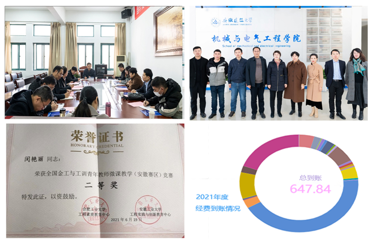 机电学院不断夯实党建工作基础,坚持党建与学院内涵式发展同步推进、同向同行,用高质量党建引领推动为党育人为国育才的初心使命。2021年全院教职工努力学思悟透习近平新时代中国特色社会主义思想,深入贯彻党的十九大暨十九届历次全会精神,把以党史学习教育的主线与推进学院建设发展紧密结合,开展了与安徽创新馆、汤池村党支部共建活动,募集钱物10000多余元助力乡村振兴,切实解决如走廊灯光昏暗等师生急难愁盼的问题。