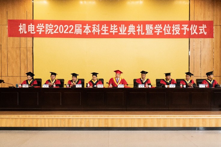 本网讯 夏木繁茂,勃勃生机;栀子花开,离歌响起。初逢在金秋九月,终别于盛夏六月。6月8日,机电学院2022届本科生毕业典礼暨学位授予仪式在综合楼二楼报告厅隆重举行。校党委书记孙道胜出席典礼,学院党政领导、教师代表、全体辅导员及2022届毕业生代表共200余人参加典礼。毕业典礼活动现场采用“线上+线下”相结合的形式,不能亲临现场的师生和家长们可在腾讯会议观看全程直播,共同见证2022届毕业生们开启人生新征程的难忘时刻。