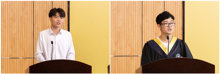非毕业班代表张宇致欢送辞。他分享了自己看到学长学姐们进出图书馆和自修室时充实忙碌的身影,那是早出晚归、风雨无阻的奋斗模样。如今硕果累累的学长学姐都是好榜样。接下来,他们也会手持接力棒继续奔跑,发扬学长学姐自强不息的精神,继续用青春汗水谱写人生未来的希望篇章。