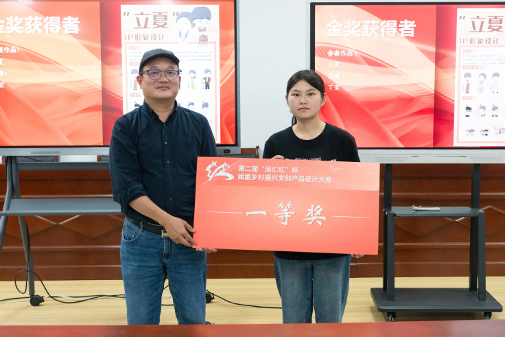 自5月7日大赛启动以来,比赛以“红色、绿色、古色”文化为主题,参赛作品中深度融入了汤家汇镇传统工艺和红色历史元素,串联起了乡村振兴的梦想与现实。这些作品不仅展示了青年学子的创造力和实践能力,更是用他们的智慧和汗水为乡村振兴贡献了青春的力量。经过一个多月的激烈角逐,从百余件作品中最终评选出6件,分别获得金、银、铜奖。在场的领导、嘉宾为获奖同学颁发奖品和证书,并合影留念。