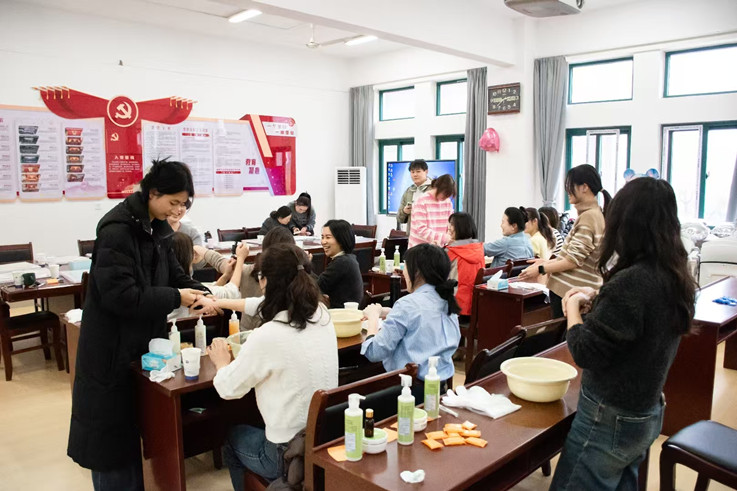 手部保养护理在工业设计系高娴和杨薇薇两位老师的悉心指导下进行;她们运用专业知识与娴熟技巧,为女教师们提供全方位手部护理保养,从清洁、去角质的基础步骤,到按摩促进血液循环的舒缓环节,再到敷上滋养手膜的深度呵护,每一个步骤都尽显专业与用心。细致入微的护理让女教师们的双手焕发出更多的活力与光彩。