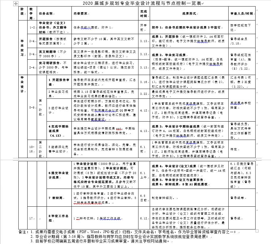 细化整个毕业设计流程规定。根据学校、学院关于毕业设计的有关规定,结合规划系《城乡规划学专业本科毕业设计管理细则(试行)》,对毕业设计的工作内容、时序、要求进行梳理汇总,按照每周工作内容,细化线上线下各环节各阶段工作任务;进一步明确节点控制要求,包括开题审查、毕业实习成果审查、毕业设计中期检查、毕业答辩资格审查和毕业答辩等环节。将流程表统一发放给指导教师和毕业设计学生,使教师、学生对整个进程和要求一目了然,便于师生有序开展工作。