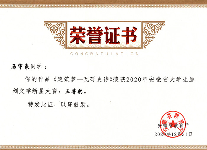 本网讯 近日,安徽省大学生原创文学新星大赛揭晓,建规学院2020建筑学专业马宇豪同学荣获三等奖。
