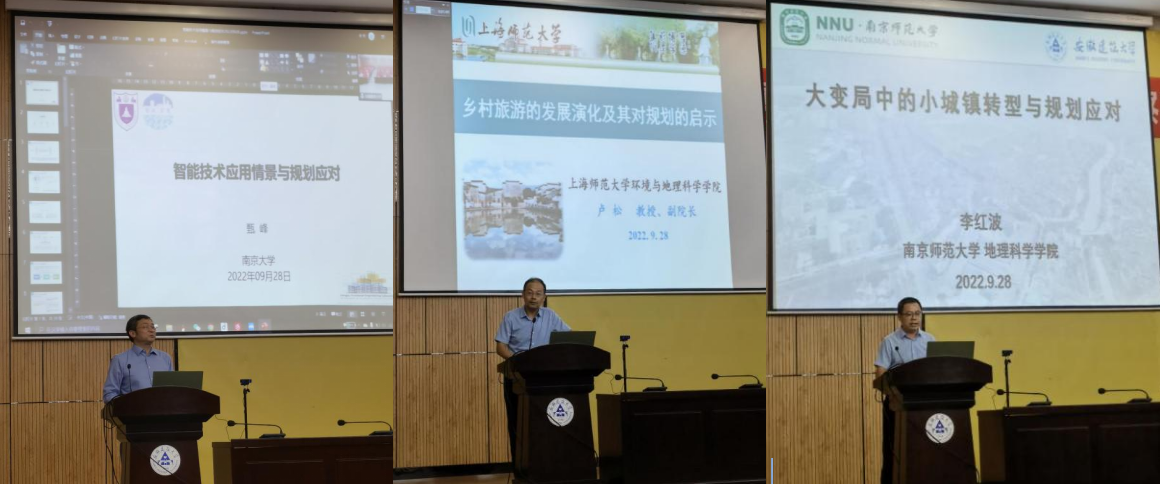 聘任仪式后,南京大学甄峰教授、北京大学王志芳教授、复旦大学包存宽教授、上海师范大学卢松教授和南京师范大学李红波教授应邀在实验综合楼二楼报告厅举办线上线下会议报告,报告会由安徽省城镇化发展研究中心主任、ku游官方建筑与规划学院教授陈晓华主持,建筑与规划学院120余名师生参加。
