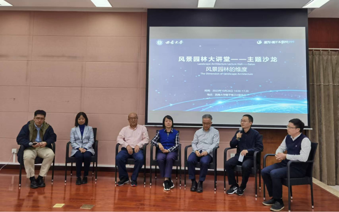 本网讯 10月28日,由西南大学主办,西南大学园艺园林学院承办的“风景园林的纬度”主题沙龙在西南大学隆平楼举行。西南大学园艺园林学院党委书记潘玉锋、院长宋洪元和与会嘉宾开展深入交流,副院长周建华主持活动。我院聂玮副教授受邀参加活动并做讨论发言。