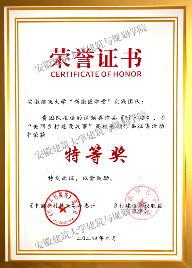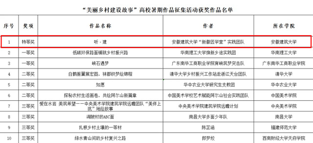 本网讯 近日,由农业农村部乡村建设促进司指导,《中国乡村振兴》杂志社和乡村建设高校联盟主办的“美丽乡村建设故事”高校暑期作品征集活动落下帷幕,由我校“新徽匠学堂”实践团队(指导教师:聂玮)申报的作品《听·建》获得本次征集活动的唯一特等奖。