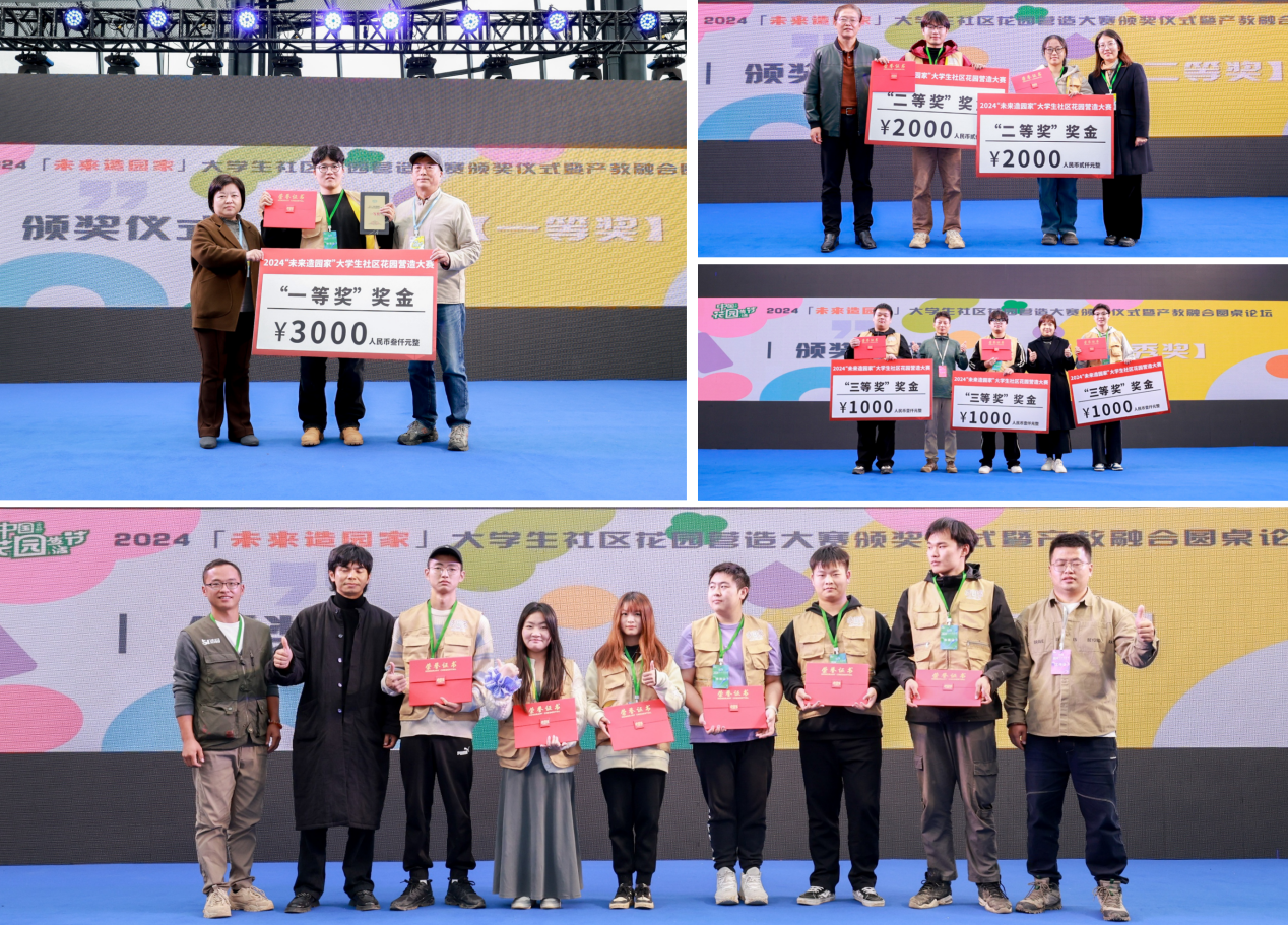 2024“未来造园家”大学生社区花园营造大赛是今年中国(合肥)花园生活节新增的亮点版块,也是全国原创并首次以现场直播+综艺打造的现象级实体造园比赛活动,来自东南大学、南京农业大学、ku游官方等12所高校风景园林、环境设计及相关专业的在校大学生经过1个月的方案火拼、线上路演等环节,站在了决赛的舞台。经历3天的现场营造与激烈奋战,12组精美的社区花园作品完美呈现,经过专家初评、大众投票、专家终审等环节,南京工程学院学生团队拔得头筹,我校学生团队获得优秀奖。李早、王勇、唐劲松等为获奖团队颁奖。