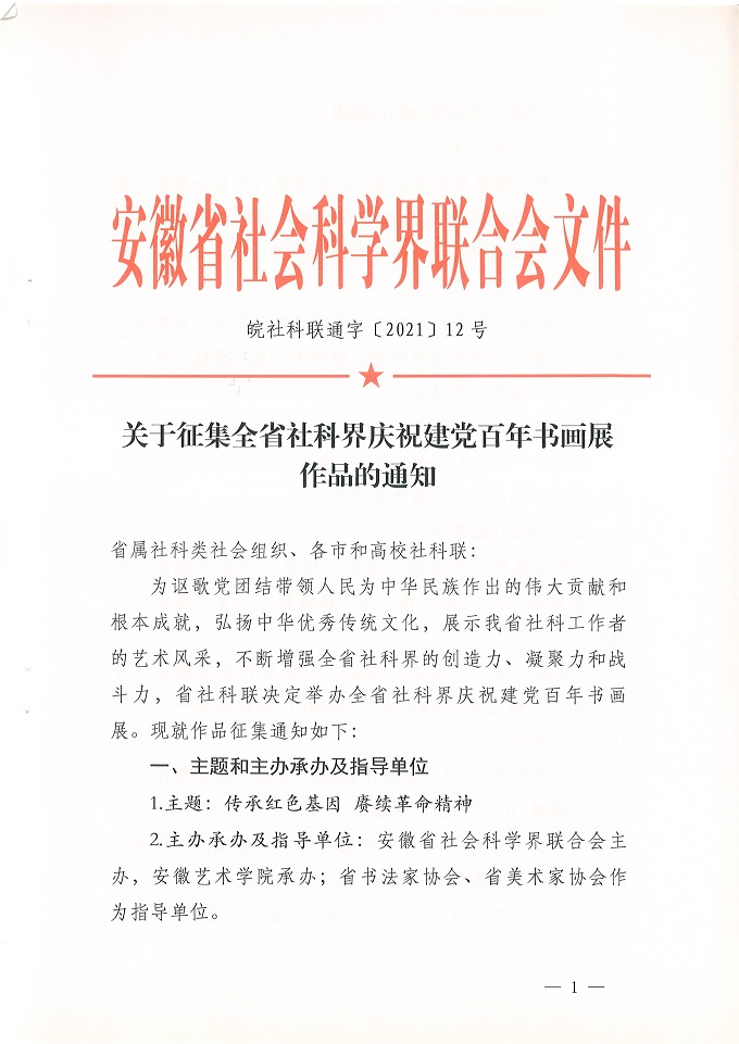 附件:《关于征集全省社科界庆祝建党百年书画展作品的通知》(皖社科联通字〔2021〕12号)