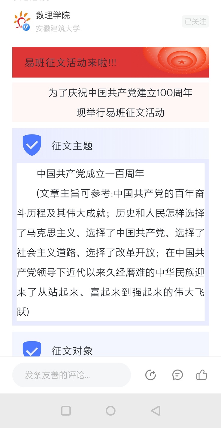 本网讯 胸怀千秋伟业,恰是百年风华。2021年是中国共产党建党100周年,为庆祝中国共产党百年华诞,激发广大学生爱党爱国的热情,近日,数理学院开展“传承红色基因,喜迎百年华诞”建党一百周年主题征文活动。