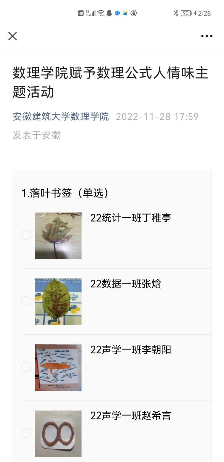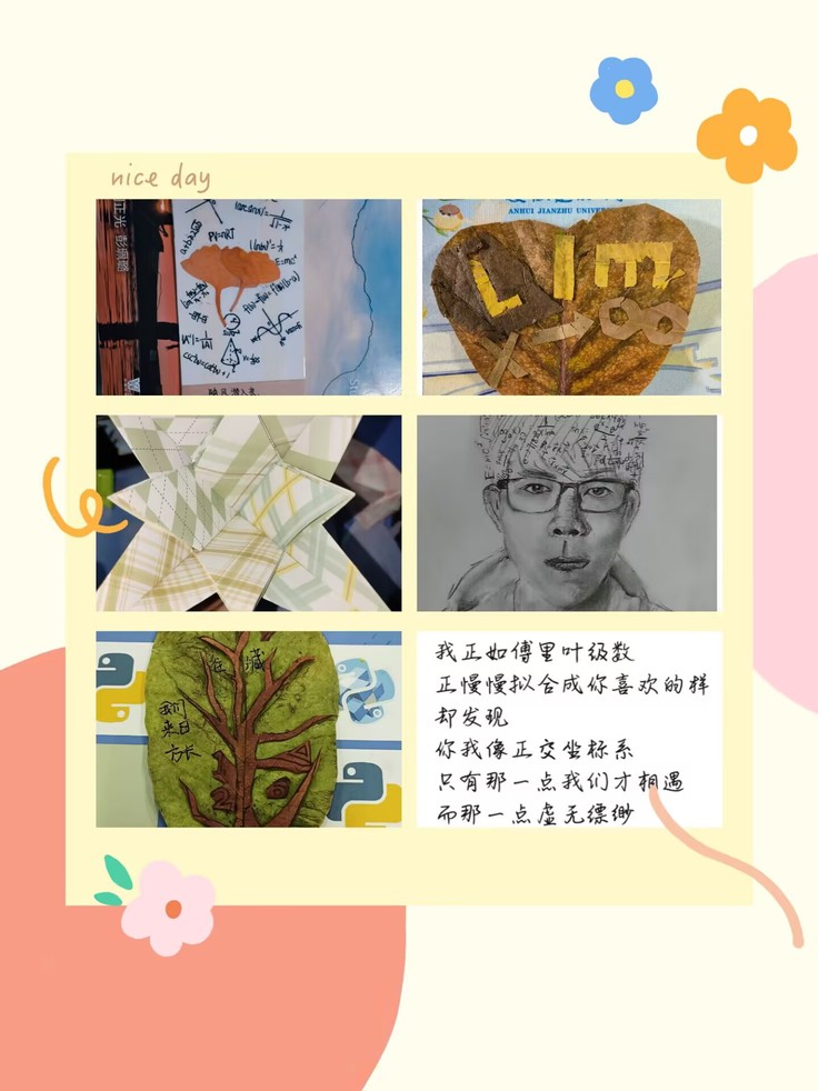 活动采取线下制作与线上征集相结合的方式开展。同学们通过新媒体平台展示自己对数理公式蕴含人情味的理解,表达出对生活的热爱与对未来的美好憧憬。同学们小心翼翼地拾取落叶,做成数学图案式的书签,并在上面写留言,一份愿望、一份祝福,赠与朋友和老师;不少同学用数学和物理公式造句,传递心灵寄语,进行情感交流,展示理工学生的那一丝丝浪漫。