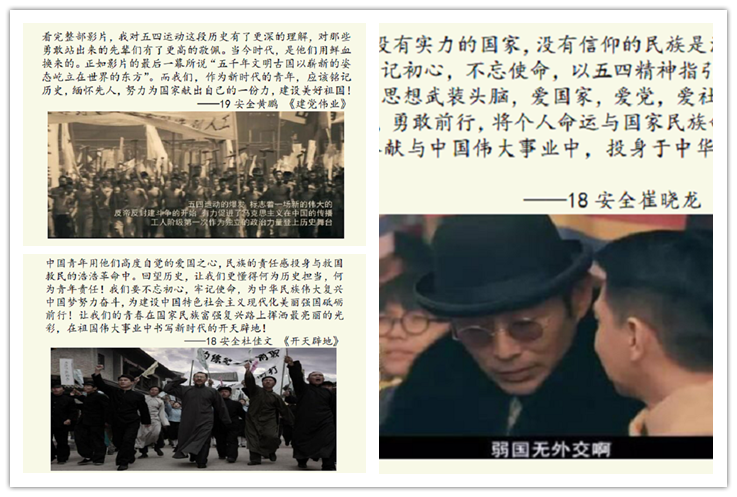 4月30-5月2日举办了“五四书影”推荐活动,倡导同学们在家观看五四电影或书籍,丰富五四运动的背景知识。同学们在看完五四书影后纷纷表示作为中国青年要不忘初心,牢记使命,用中国特色社会主义思想武装头脑,将个人命运与国家民族命运紧紧联系,将无悔青春奉献与中国伟大事业中,投身于中华民族伟大复兴中。“弱国无外交,没有实力的国家,没有信仰的民族是没有话语权的!中国青年要以五四精神指引自己,爱国家,爱党,爱社会主义高度统一,不畏奋进,勇敢前行!”崔晓龙同学在观看完电影《我的1919》后这样写道。