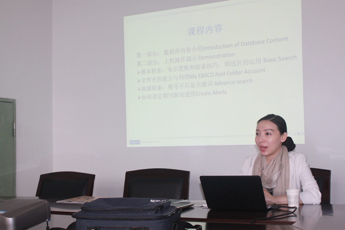 会上,EBSCO公司大区负责人就“EBSCO人文学全库”内容及使用技巧作了详细讲解。由于现场老师们踊跃咨询,原计划40分钟的会议延长约一个小时。此次培训让老师们掌握了电子资源使用技巧,为其今后开展科学研究助力,也是学科化服务的一项有益探索。