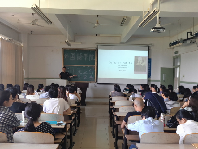 本网讯 近日,美国俄亥俄州州立大学教授把嶙博士应外国语学院邀请,来校举行“莎士比亚:戏剧与故事”讲座,外国语学院全体教师以及来自其他专业学生共同聆听了讲座。讲座由副院长徐春山主持。