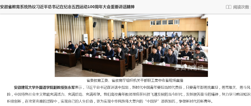 本网讯 在五四运动100周年到来之际,中共中央总书记、国家主席、中央军委主席习近平在纪念五四运动100周年大会上发表重要讲话。外国语学院高度重视学习宣传工作,组织师生及时聆听习近平总书记讲话和开展学习研讨。日前,安徽教育网刊登全省教育系统学习贯彻习近平五四讲话精神感言。作为全省高校教师代表发言,ku游官方外国语学院张永军副教授的学习感言入选。