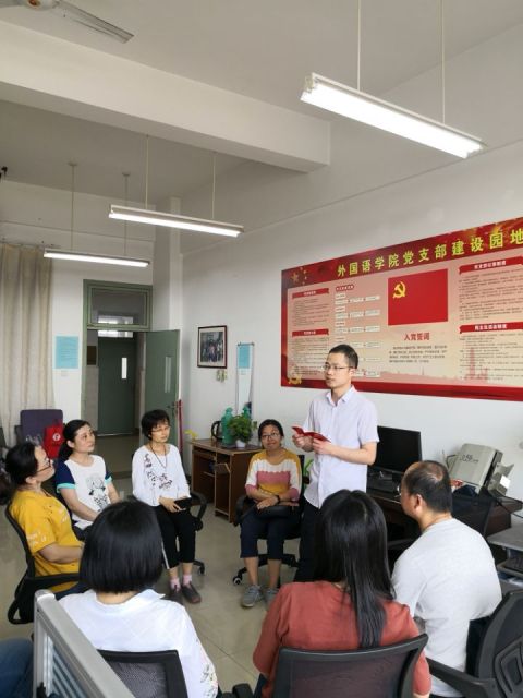 本网讯 5月29日,外国语学院召开党员大会,院党总支书记林莉兰传达了校党函〔2019〕48号《关于深入学习贯彻落实<中国共产党支部工作条例(试行)>的通知》,结合院党总支理论学习中心组学习《条例》情况,就各支部做好《条例》学习研讨进行了部署。林莉兰还传达了院党总支中心组根据《条例》制作的《党支部年度工作节点表》,并进行了讲解。