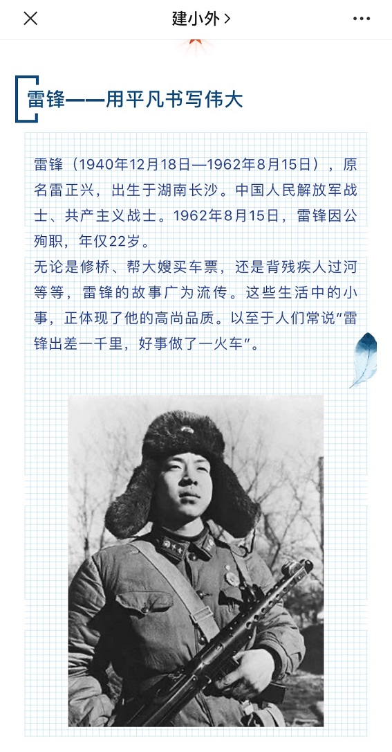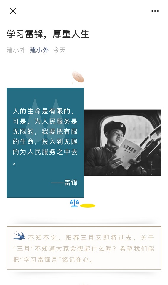 发布雷锋主题推文,传承雷锋精神外国语学院利用微信公众号QQ工作群等多个渠道,向广大青年学生发出向雷锋同志学习的倡议,大力宣传雷锋同志的先进事迹和雷锋精神。